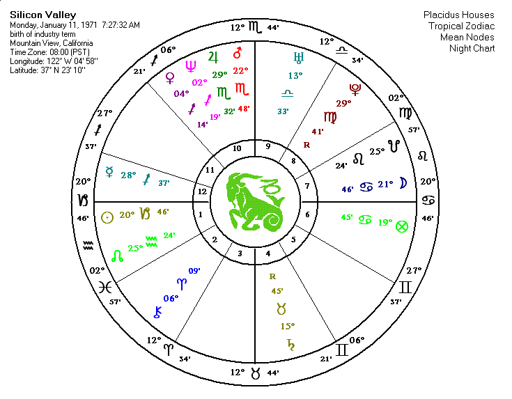A chart for this date (set for sunrise, Mountain View, Santa Clara County, CA) can be used for charting American high-tech industry. The business-oriented Capricorn Sun forms an Earth Grand Trine with Pluto and Saturn, making this entity a self-sustaining engine for financial growth. Jupiter at 29º Scorpio is well placed with respect to California's horoscope, and also supports Pluto in the 8th house of venture capital.