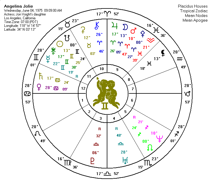 Angelina Jolie (June 4, 1975; 9:09 am; Los Angeles, CA) was born with a Sun-Juno conjunction, which naturally leans toward marriage. Conversely, her several Aries placements and an unusually prominent Uranus (square Venus and the Ascendant, trioctile her Sun) keep her highly independent of social expectations. However, by secondary progression, her Juno is in the family sign of Cancer and being awakened by the current Uranus-Pluto transit. She admits she’s doing it for the kids.