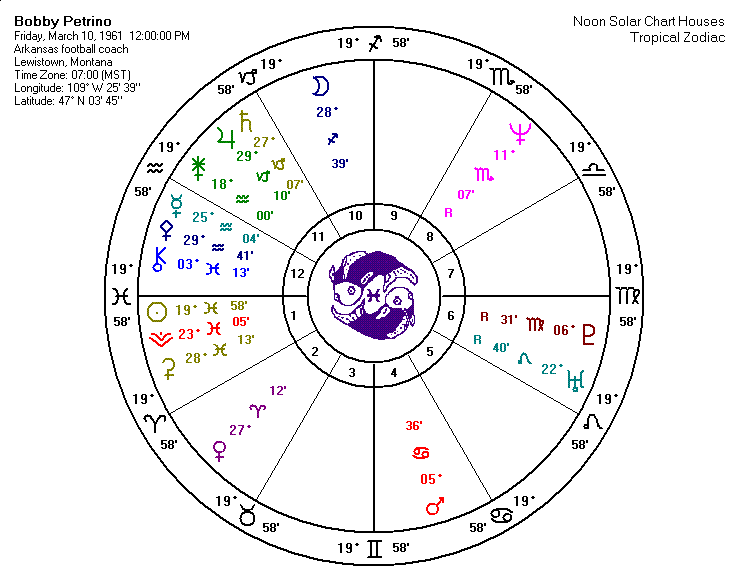 Bobby Petrino was born with his Pisces Sun conjunct Vesta and Ceres (March 10, 1961; Lewistown, MT; time unknown), two asteroids which have shaped his professional career. The Sun-Vesta provides mental focus and devotion to his calling, while the Ceres influence adds paternal caring to the player-coach relationship. The Sun is also quincunx Uranus, which fosters unpredictable or impulsive behavior.