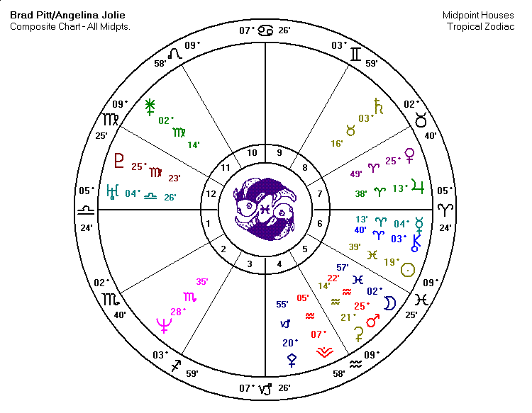 In their composite chart, Juno in duty-conscious Virgo trines Saturn, a very traditional set-up that has kept their relationship solid for years. Juno also squares Neptune and opposes the Pisces Moon, which adds much secretiveness as well as uncertainty about the couple’s real status. Currently, transiting Neptune is activating the Moon-Juno opposition, creating hope for a glamorous wedding. The dazzling diamond ring is a clear manifestation of this Neptune factor in Brad’s chart and their composite Juno.