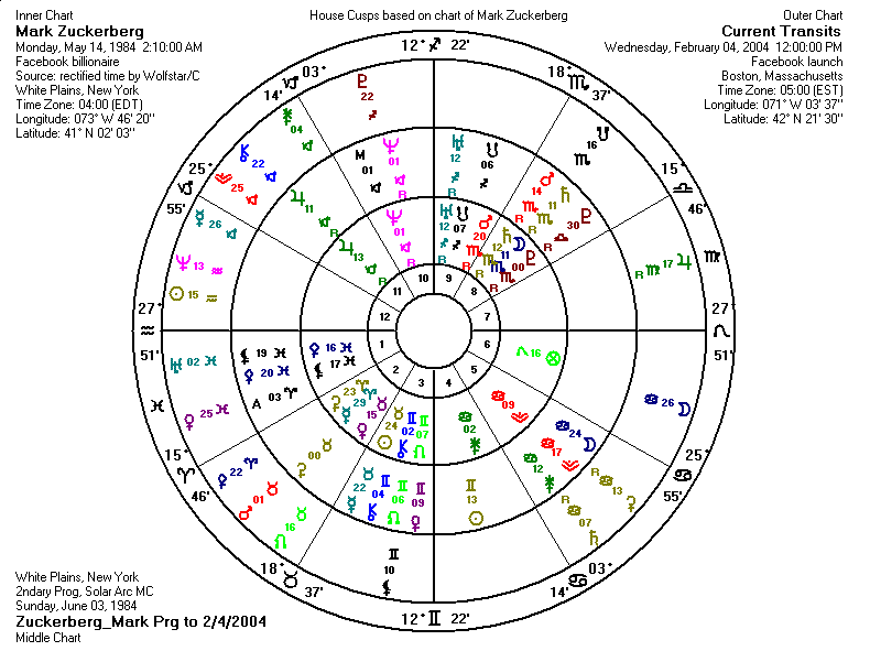 Zuckerberg launched Facebook from his college dormitory on February 4, 2004 when transiting Uranus was near his Ascendant and forming an empowering trine to natal Pluto. Also at this time his Sun had progressed to 12º Gemini where it was perfectly aligned with Uranus at his Midheaven. In essence, his ambitious little project became the medium that shaped the global village.