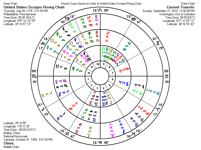 Over the past few years, the transiting Uranus-Pluto square has activated both China’s and the U.S.’s natal planets in the 13º-14º range, increasing their economic interdependence. Uranus has moved on but Pluto remains in this degree area, and will turn direct in late September at 13º Capricorn. This station squares China’s Mercury-Neptune-Ceres triple conjunction in Libra, and opposes the U.S. Sun, intensifying all cultural, political and economic interactions.