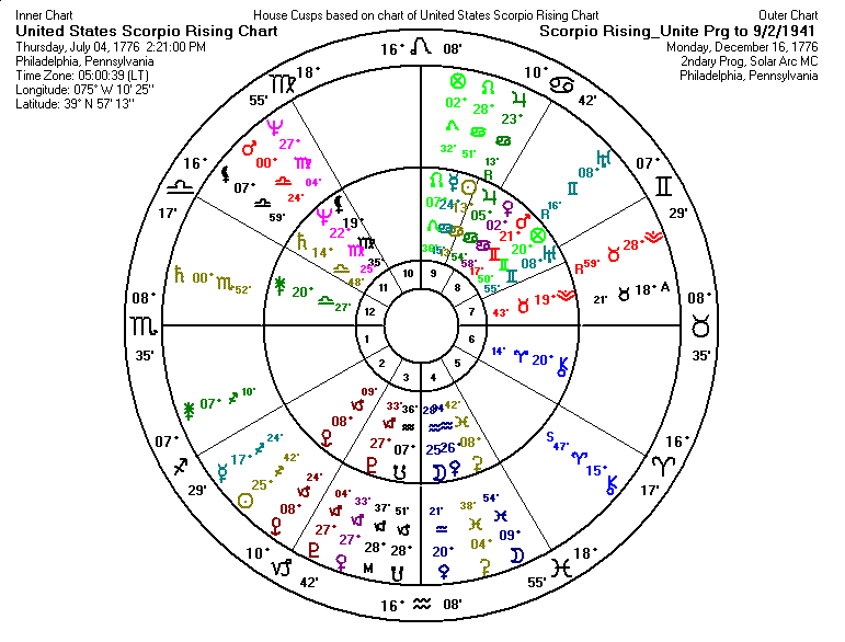 Normally we consider Venus to symbolize diplomacy, peace accords, and living in harmony. However, uniquely in the U.S. Scorpio Rising chart, Venus is associated with a consistent war cycle. In my book Political Astrology (published in 2005), I outlined this war pattern: "When Scorpio is the Rising sign, Taurus is on the seventh house cusp of ‘open enemies’, and Libra is on the twelfth of ‘hidden enemies’."