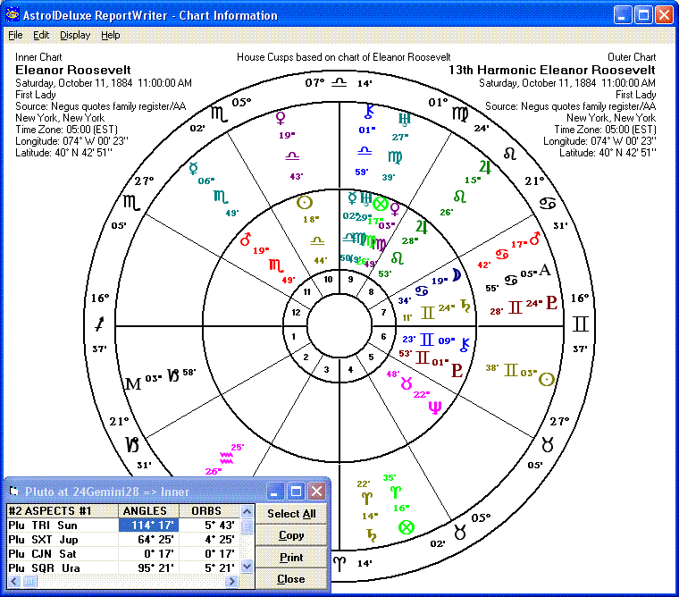 After you display a Harmonic chart (but not a Modulus chart), you will now have a choice on the File menu - Compare Harmonic Chart to Natal Chart. This is consistent with what Robert Hand does in Chapter 11 of Essays on Astrology where he inserts the 13th harmonic planets around natal charts for himself, Richard Nixon, and Eleanor Roosevelt and notes the aspects formed to the natal planets. For example, Eleanor Roosevelt's natal Saturn in the Seventh House conjoins her 13th harmonic Pluto. My wife's natal Jupiter in the Seventh House conjoins her 13th harmonic Uranus. Apparently, Seventh House interharmonic aspects can describe the spouse.